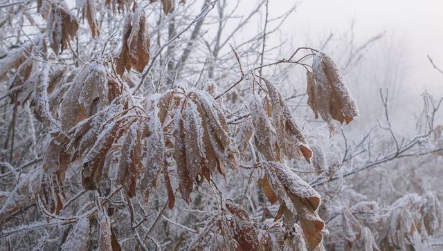 Hoarfrost-coated brown leaves draping misty winter thicket at dawn