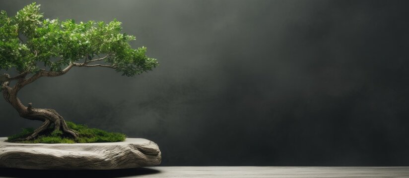 A natural looking grey wooden stand adorned with a lush green branch providing ample copy space for any desired content