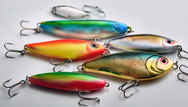 Creative arrangements of wobbler lures. Fishing lure with hooks. Plastic fish with hooks. Flat lay or top view.