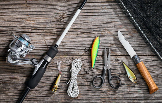 Fishing background angler wobbler and poppers spinning bait concept on wooden background