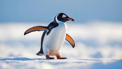 Gentoo penguin lifts its foot while waddling through the snow