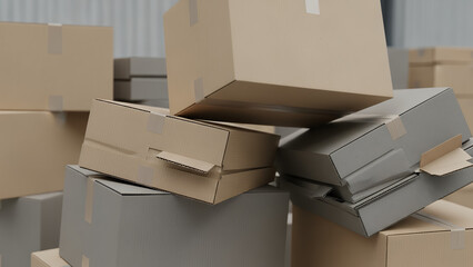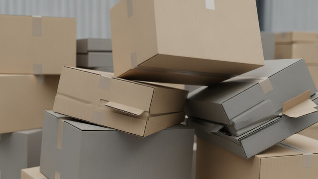 Cardboard boxes stacked and wobbling in a warehouse storage facility from a close-up viewpoint