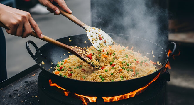 Freeze Motion of Wok Pan with Flying Ingredients in the Air and Fire Flames.