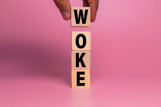 male hand put wooden blocks with woke word symbol isolated on pink background