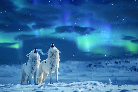 Wolves in Winter: A pair of majestic wolves stand facing each other in a snowy forest, their intense gaze locked in a moment of connection, embodying the spirit of the wild.