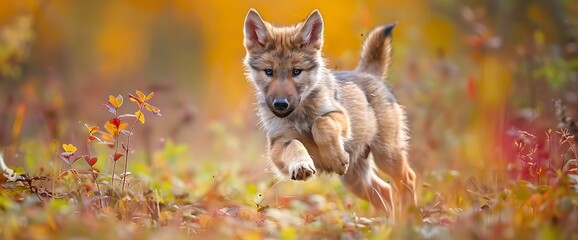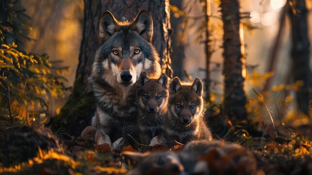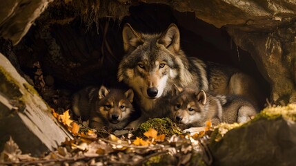 Cozy Wolf Den with Curious Pups in Nurturing Autumn Habitat