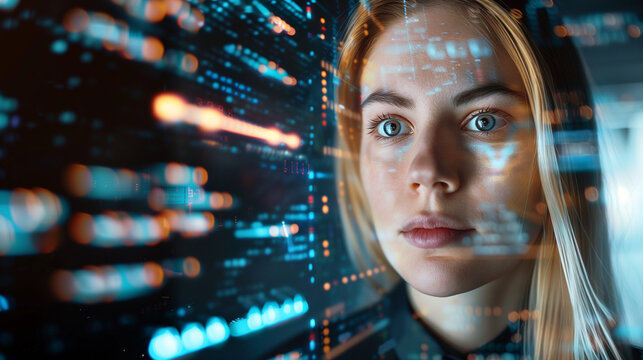 Data Analyst Woman with Digital Interface. A focused young woman analyzing data through a holographic digital interface, reflecting the modern intersection of technology and analytics.