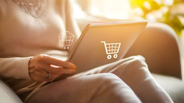 Senior woman using a tablet for online shopping while sitting on a sofa in a cozy home setting