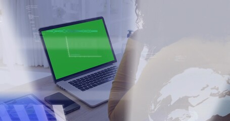 Typing woman in mustard top using laptop green screen at home, tablet, phone, overlays, copy space