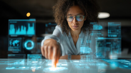 Innovative woman interacting with futuristic digital interface, analyzing data and technology in modern workspace. Her focused expression reflects determination and intelligence
