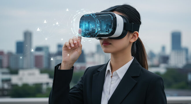 Virtual empowerment: businesswoman embraces VR technology to manipulate charts and graphs