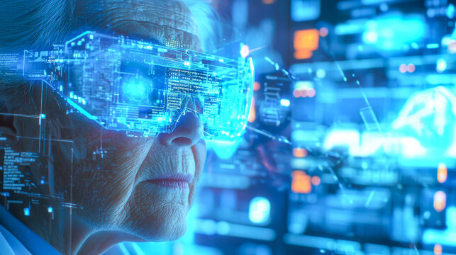 Elderly caucasian female embraces futuristic augmented reality technology