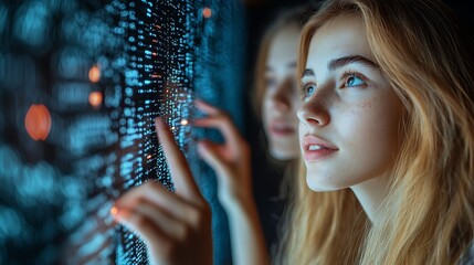 Future Tech Interface: A young woman in the realm of futuristic technology, exploring a data-rich interactive interface, as she embraces the promise of innovation and cutting-edge advancements.