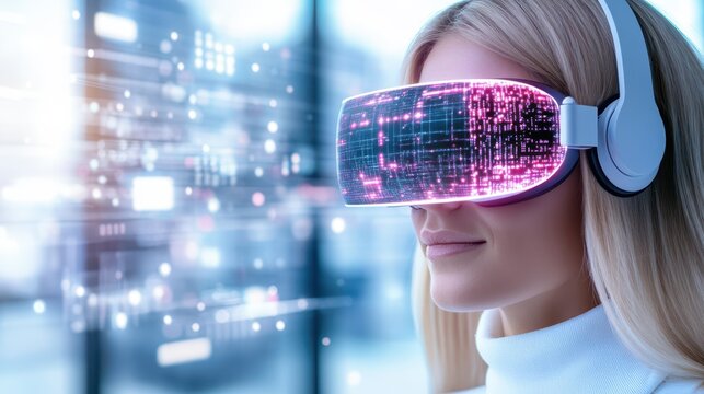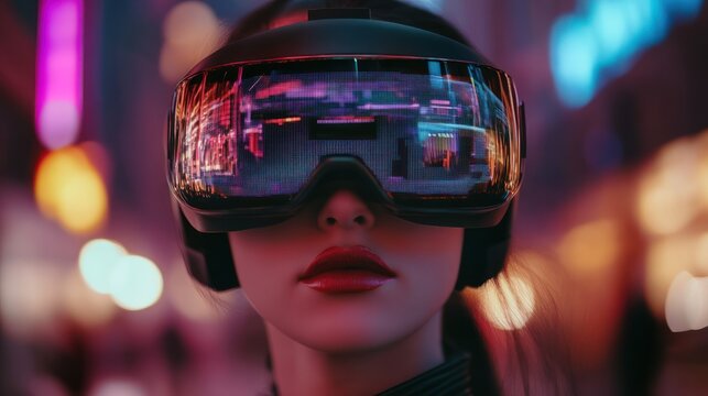 Close-up of a woman wearing futuristic VR goggles, immersed in a digital world filled with vibrant data and technology visuals.