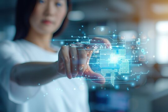 Woman Engaging With Digital Interface In Modern Technology Visualization Images