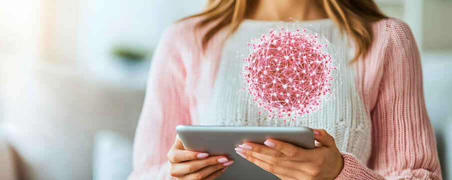 Woman exploring digital world, tablet interface unleashes a myriad of vibrant icons