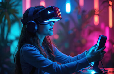 Young woman wears VR headset, headphones. Holds glowing tablet device. Bright neon blue, pink lights illuminate futuristic room. Girl interacts with advanced tech, exploring digital world gaming