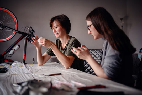 Two women sitting at a table indoors, fixing a bicycle and enjoying tea. The scene is casual and friendly, highlighting teamwork and relaxation.