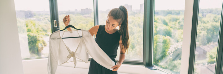 Buying new clothes Asian woman happy looking at purchase of fashion white top from clothing store panoramic banner.