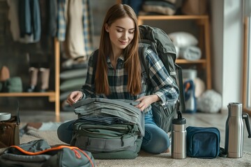 A young woman sitting on the floor inspecting clothes with an open hiking backpack nearby.