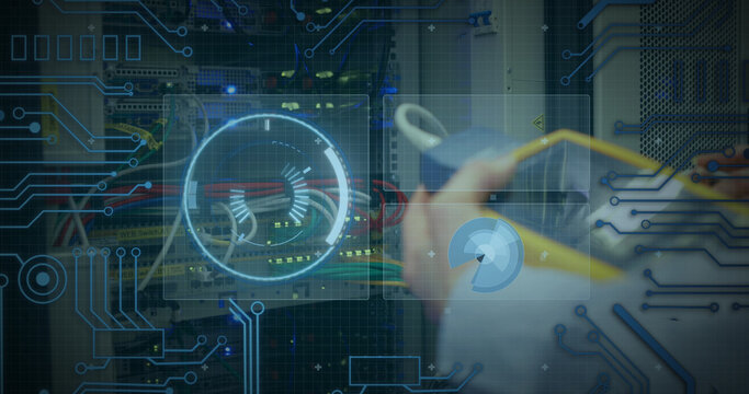 Female it engineer inspecting server rack with futuristic network visualization overlay