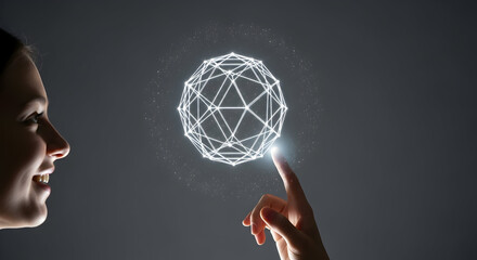 Woman interacting with virtual reality interface and hexagonal grid overlay