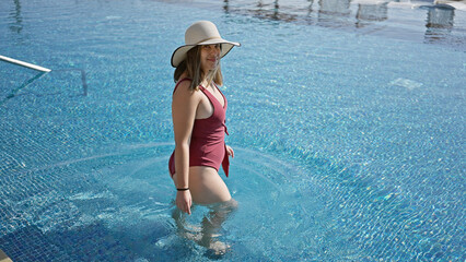 Woman relaxing in swimming pool summer vacation happy lifestyle red swimsuit sun tanning enjoying water leisure