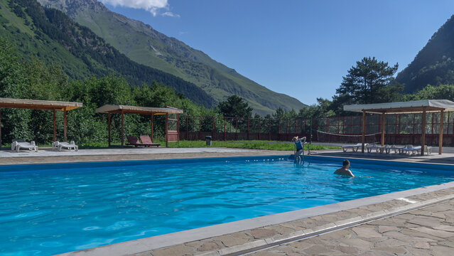 The pool is surrounded by snow-capped mountains in summer. Relaxing by the water in the fresh air. Sun loungers for relaxing and sunbathing. People swim in an open-air pool in the mountains.