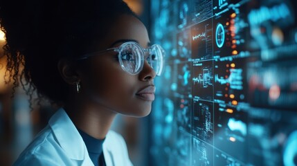 Female scientist working with futuristic digital interface filled with holographic data analytics modern laboratory environment symbolizing research healthcare innovation and science discovery