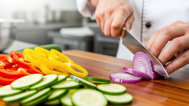 Close-up of a professional chef's hands skillfully slicing a vibrant green bell pepper