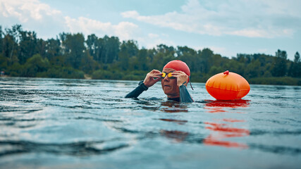 Gazing swimmer wearing swim cap through water droplets closeup showing focus and strength