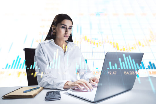 Woman typing on laptop, financial graphs overlay, white background