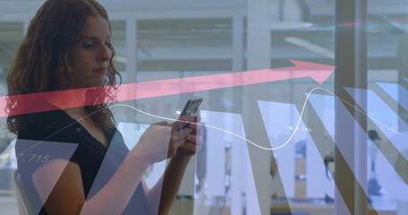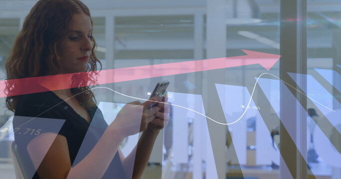 Image of financial data processing over caucasian woman using smartphone
