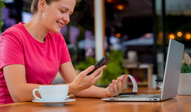 Woman using mobile phone to scan the QR code for the bill through the app, smartphone with blank screen.