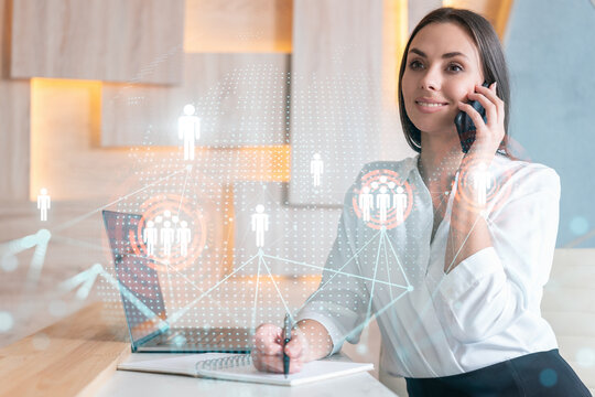 Attractive businesswoman in white shirt has conference call to hire new employees for international business consulting. HR, social media hologram icons over office background