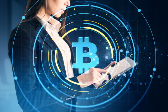 Businesswoman using tablet with glowing bitcoin symbol overlay and digital network graphics on dark background, representing cryptocurrency concept.