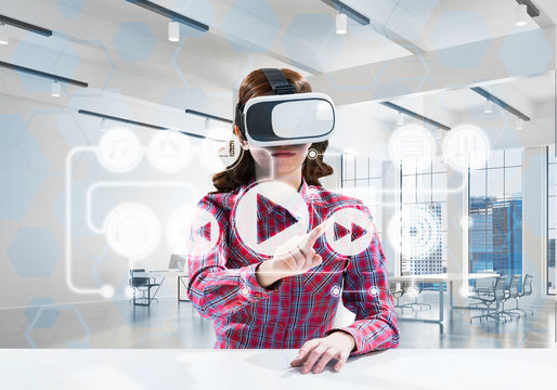 Woman Using Vr Headset For Data Processing With Holographic Interface Images