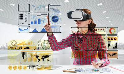 Woman using vr headset with data visualization interface