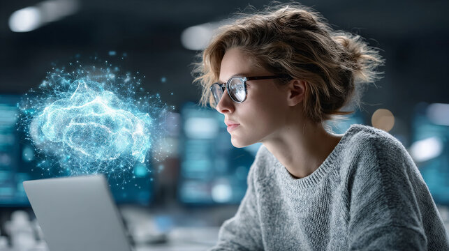 Focused engineer working with artificial intelligence, using laptop to visualize futuristic brain technology concept