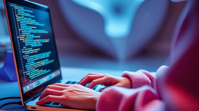 Womans Hands Typing Code On Laptop Data Interface Overlay Images