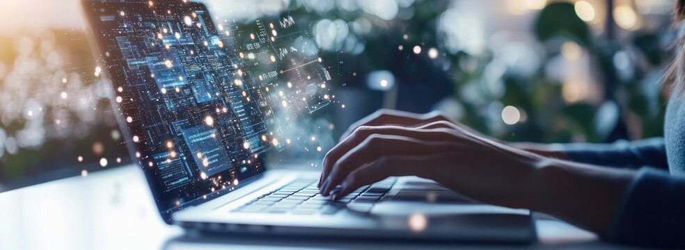 Close up of hands typing on laptop with futuristic holographic interface overlaying the keyboard