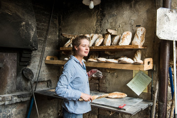 Young woman baking loaves of bread in an outdoor brick oven, Tuscany, Italy.
