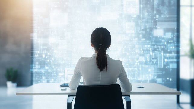 Professional woman using laptop with digital data efficiency graphics in modern office setting showcasing technology and productivity. Asymptotic smart data analytic.