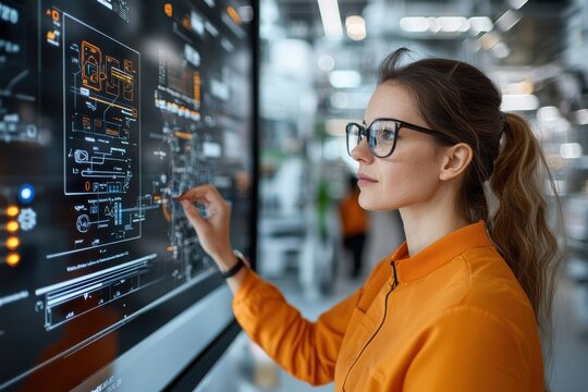 A focused woman in glasses interacts with a high-tech touchscreen displaying data and graphs in a modern environment.