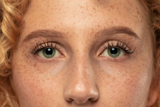 Close up of one eye of young red ginger freckled woman with perfect healthy freckled skin, looking at camera. Ophthalmology, Vision care