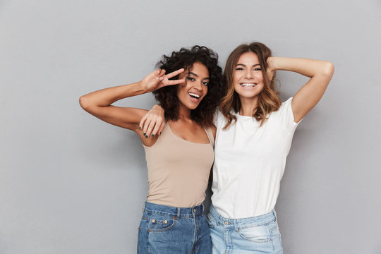 Portrait of three young diverse women wearing white shirts looking at camera while posing together isolated over grey background