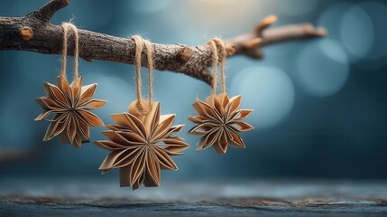 Minimal wooden table with potted branch, glass and book in soft natural sunlight, scandinavian inter