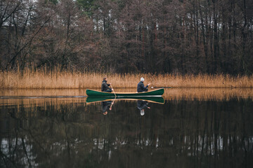 Two men paddling a beautiful green canoe on the river. Spring or autumn scene with a wooden boat on calm water