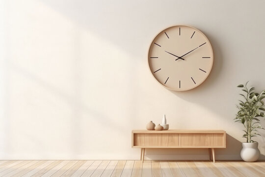 Sunlit minimalist wall clock casting window shadow with soft morning light