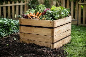 Wooden compost bin filled with fresh carrots, beets, and greens in a garden setting with dark soil and scattered wood